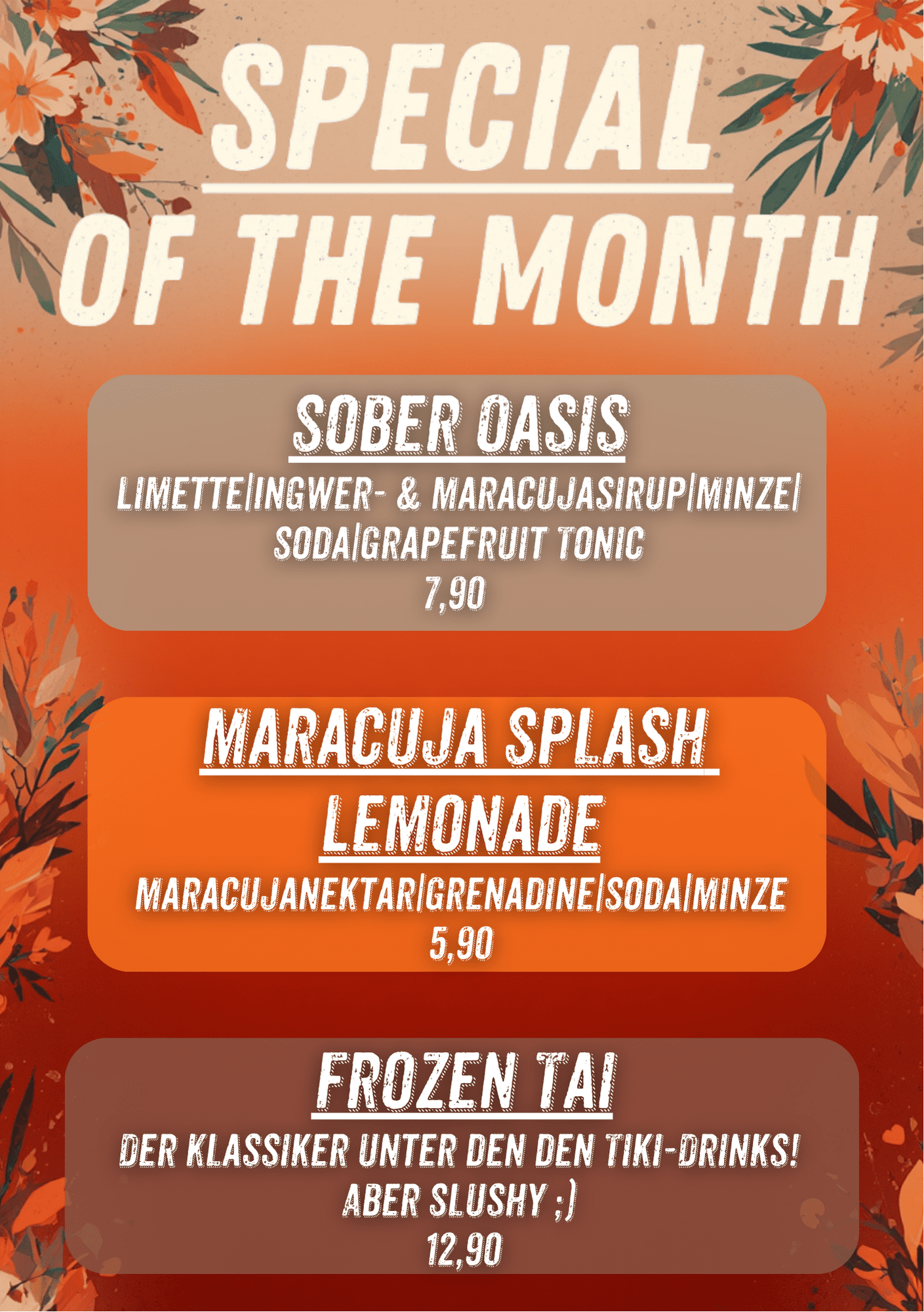 Ob Klassiker, exotische Tiki-Drinks oder 1,5-Liter-Pitcher – bei uns ist wirklich alles mit dabei. Also: Einfach zurücklehnen, genießen und den Abend feiern!